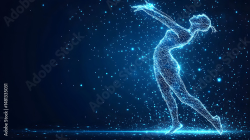 Dynamic digital dancer rendered in glowing blue wireframe against a cosmic dark blue background. Perfect for tech, dance or futuristic themes. Abstract wireframe in dark blue.