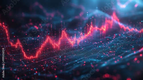 Dynamic digital graph with red and blue lines, representing data fluctuations and trends against a dark background.