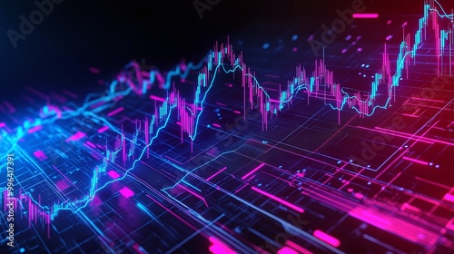 Dynamic digital stock market graph with vibrant colors on black background.