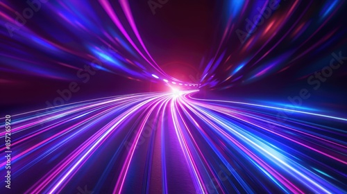 Dynamic, futuristic light streak effect with a central vanishing point, showcasing a convergence of blue, purple, and pink neon-like lines against a dark background