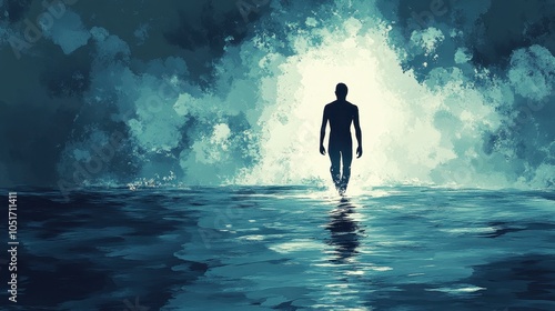 Dynamic illustration of a figure walking on water, symbolizing miracles and the extraordinary aspects of belief and faith.