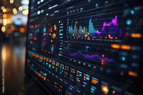 dynamic interface on a computer screen showcasing business process automation analytics with colorful graphs and data visualizations that illustrate efficiency and technological advancement