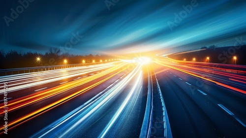 Dynamic night scene of a highway with vibrant light trails, showcasing the speed and motion of vehicles on the road.