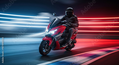 advertisement, asian, indian, model, motorcycle, scooter, rider, night, speed, urban, road, neon, light, red, blue, dynamic, motion, blur, fast, street, racing, transport, vehicle, helmet, jacket, journey, travel, modern, futuristic, abstract, glow, exciting, cool, stylish, asphalt, movement, action, energy, power, freedom, adventure, sport, thrill, powerful, city, dark, highway, turn