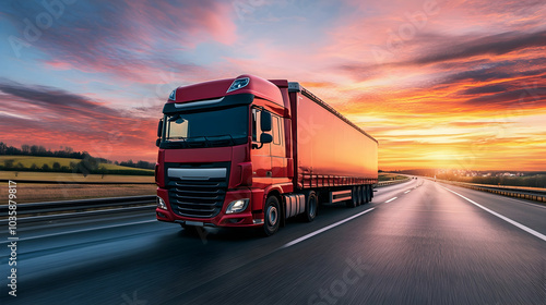 Dynamic shot of a red truck on a highway against a colorful sunset sky -