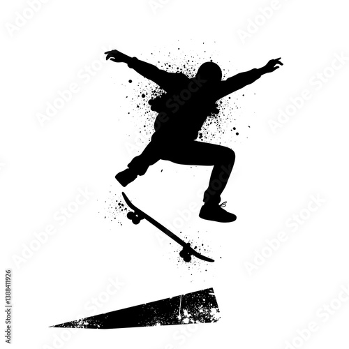 skateboarder, skateboarding, skate, trick, ramp, silhouette, action, sport, extreme, jump, air, board, rider, dynamic, energy, movement, freestyle, athlete, skill, adrenalin, competition, style, cool, graphic, design, vector, illustration, art, black, white, transparent, background, ink, splatter, grunge, activity, hobby, lifestyle, recreation, fun, passion, speed, power, balance, control, operated, flying, skilful