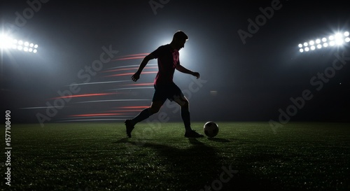 soccer, football, player, athlete, sport, ball, field, stadium, light, night, silhouette, motion, blur, action, dribbling, kick, game, competition, training, professional, championship, match, green, grass, energy, power, speed, dynamic, illuminated, dark, spotlight, performance, exercise, fitness, goal, team, victory, success, challenge, determination, dramatic, intense, moody, atmospheric, movement