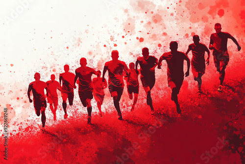 Dynamic silhouettes of athletes sprinting against a vibrant red backdrop