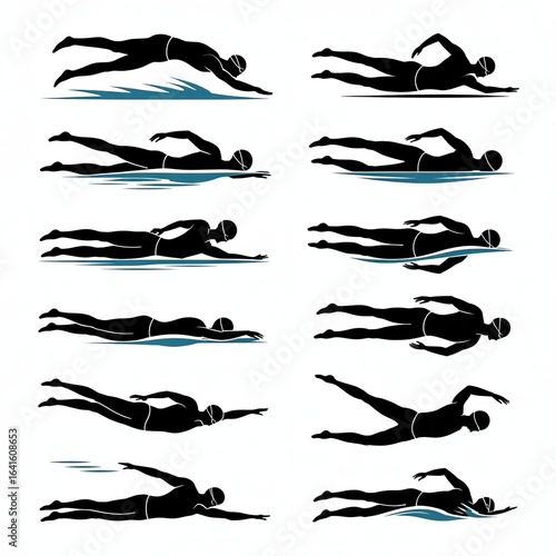 Dynamic silhouettes of swimmers in various freestyle strokes showcasing athletic power and graceful movement