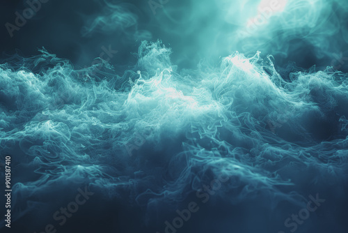 Dynamic smoke clouds are illuminated by a neon turquoise texture. like an underwater scene.