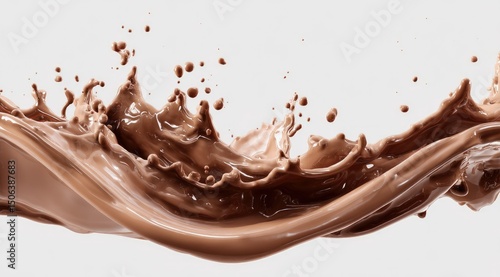 chocolate, liquid, splash, wave, brown, creamy, rich, smooth, flow, dynamic, motion, movement, droplet, airborne, texture, delicious, sweet, cocoa, beverage, drink, dessert, milk, confectionery, syrupy, viscous, glossy, shiny, swirl, curve, cascade, pouring, falling, energy, power, intensity, white, background, contrast, photo, image, studio, clean, pure, tempting, indulgence, treat, deliciously