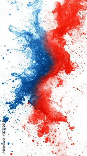 Dynamic splash of vibrant blue and red paint explodes across a white backdrop. A captivating contrast of color and movement.