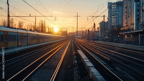 train track, sunset, orange, evening, landscape, travel, transportation, rail, city, scenic, sky, horizon, photo, urban, line, cloud, journey, adventure, sharpened, bright, light, destination, exploration, mood, transport, railway, commute, field, nature, view, peaceful, dynamic, industrial, passenger, traveling, vintage, old world, scenic route, train journey, discover