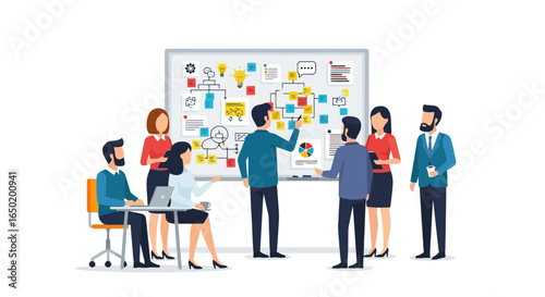 Dynamic Team Collaboration Session with Visual Strategy Board, Ideal for Business Planning, Project Management, and Creative Problem Solving in a Modern Workplace Environment