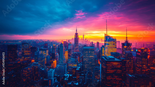 urban, skyline, dusk, illuminated, skyscraper, dynamic, vibrant, modern, light, city landscape, building, architecture, sunset, twilight, metropolitan, nightscape, highrise, downtown, colourful, night, evening, bustling, crowded, lively, futuristic, corporate, office, high technology, urbanisation, infrastructure, development, horizon