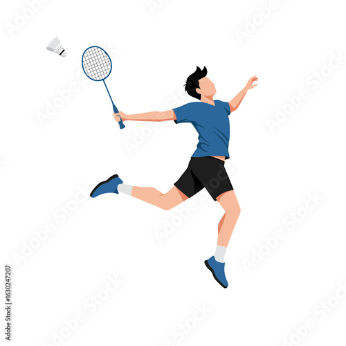 Dynamic vector illustration of a man playing badminton, jumping for a smash shot.