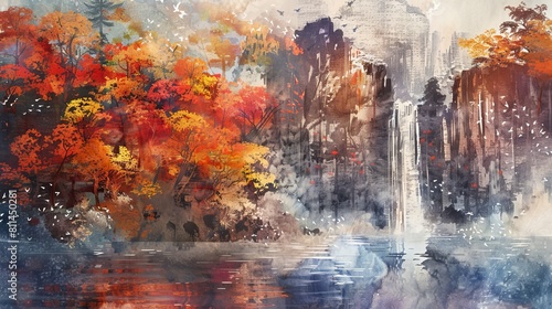 dynamic, watercolor, waterfall, crumbled, lake, fiery, autumn, tree, cliff, surround, leaves, colourful, brushstroke, warmth, water, palette, technique, design, foliage, mountain, scenery, nature, fresh, layer, boulder, bright, texture, cascade, detail, creation, pigment, stunning, airy, majestic, vibrant, beauty, landscape, artist