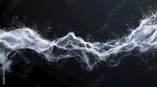black, white, wave, wavy, line, curve, fluid, dynamic, motion, flow, smoke, water, vapour, mist, particle, dot, scatter, central, center, abstract, artistic, design, texture, pattern, ripple, swirl, movement, energy, soft, smooth, elegant, minimalist, monochrome, contrast, depth, illusion, surreal, dreamy, atmospheric, aethereal, liquid, undulating
