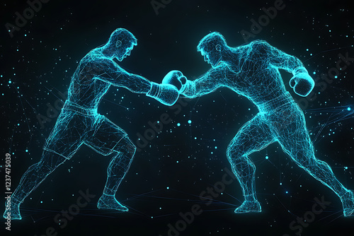 boxer, boxing, fighter, athlete, sport, competition, punch, wireframe, digital, technology, glowing, dynamic, movement, action, fight, combat, graphic, illustration, concept, strength, power, activewear, training, fitness, aggressive, martial art, dark background, sports equipment