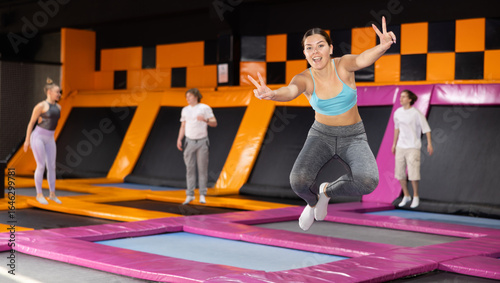 Dynamic young woman wearing sport clothes high jumping in trampoline arena