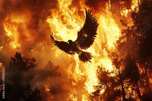 eagle, bird, fire, flames, forest, inferno, wildfire, ablaze, burning, tree, smoke, soaring, flight, wing, silhouette, danger, heat, destruction, nature, disaster, calamity, catastrophy, emergency, crisis, chaos, devastation, power, intense, bright, orange, yellow, red, hot, dark, contrast, powerful, majestic, wildlife, environment, loss, survival