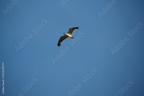 Eagle soaring high above a clear blue sky during a sunny day