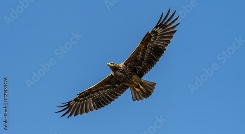 eagle, soaring, blue, sky, wing, flying, brown, feather, bird, upward, gliding, light, day, outside, natural, wildlife, animal, nature, freedom, aerial, sunny, high, elevation, calm, peaceful, up high, clear, open, landscape, background, image, photo, illustration, poster, website