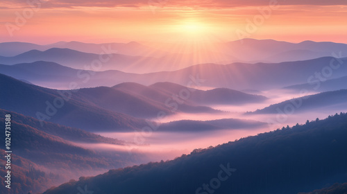 Early Morning Sunrise Behind Mountain Peaks with Mist