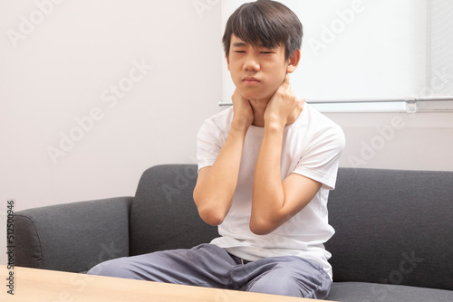 Early osteochondrosis. Teenage boy holding his hand behind his neck sitting on sofa at home.