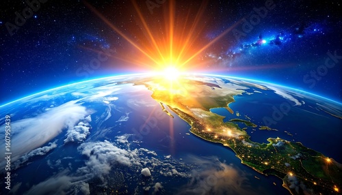 Earth from space, sunrise over Americas. Vast expanse of dark space, bright sunrise radiating outward. Detailed continents, clouds, and city lights
