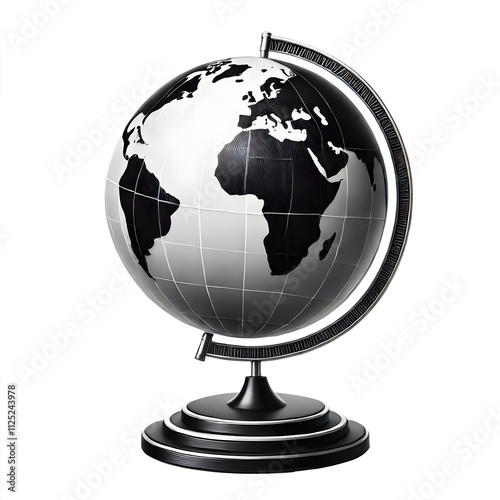Earth globe black and white render, planet globe on stand isolated on a transparent background.
