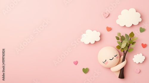 Earth's Tender Care: Sapling Surrounded by Pastel Clouds and Floating Hearts