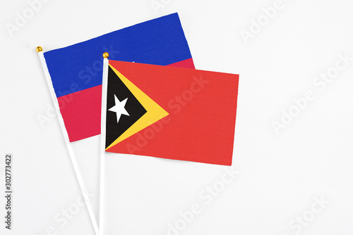 East Timor and Haiti stick flags on white background. High quality fabric, miniature national flag. Peaceful global concept.White floor for copy space.