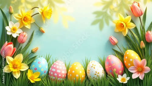 Easter background, include colorful decorated Easter eggs, spring flowers (tulips and daffodils), copy space in the middle, horizontal