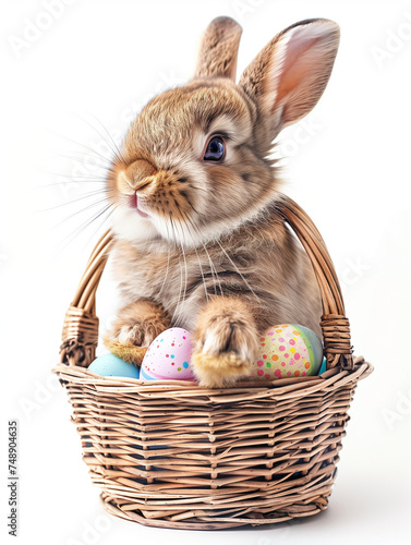 Easter Bunny with Decorative Eggs in Basket, on an isolated white background
