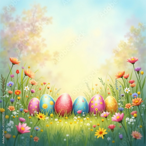 easter, grass, egg, spring, egg, holiday, sky, nature, decoration, flower, celebration, green, season, meadow, easter egg, colours, vector, colourful, illustration, yellow, design, field, symbol, april, traditional