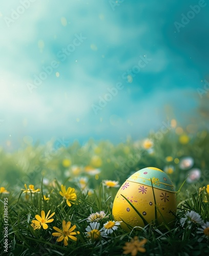 Easter day egg laying in the grass with beautiful flowers in the background, in the style of light sky-blue and dark emerald.