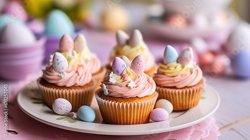 Easter Delights, Tempting Cupcakes Plated and Ready for Indulgence. Generative AI