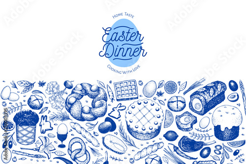 Easter dinner banner template. Vector hand drawn illustrations. Happy Easter dinner retro design. Background with food, meat, vegetables, pastry, bakery.