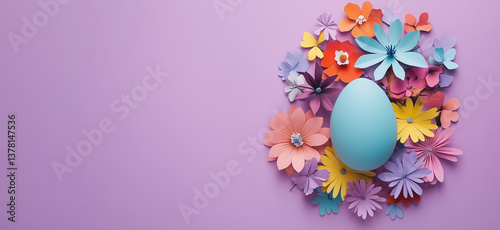 Easter Egg Floral Banner - Paper-Cut Flowers on Violet Background (Flat-Lay, Copy Space, Ready-to-Use Design)
