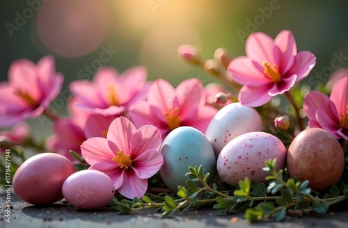 Easter eggs and pink flowers create a beautiful spring decor. Decorated Easter eggs.
