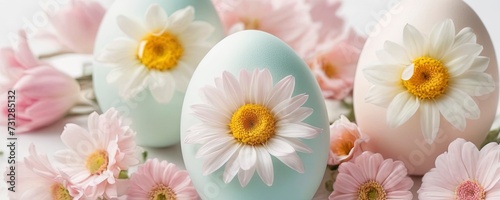 Easter eggs colored and Flowers daisies Elegant Blue and Pink Pastel colors background Good for Happy Easter banner, cookbooks, ingredients, healthy food blog. Generative AI