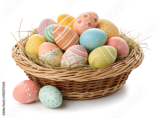 easter, basket, egg, egg, holiday, spring, decoration, celebration, food, colours, colourful, easter egg, symbol, tradition, wicker, isolated, yellow, green, blue, seasonal, closeup, season, traditional, coloured, orange