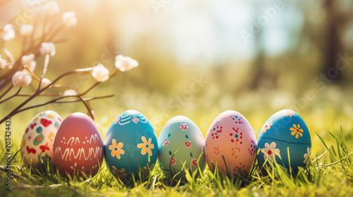 Easter eggs in grass, Painted easter eggs celebrating a Happy Easter on a spring day with a green grass meadow, bright sunlight, tree leaves and a background with copy space and a wooden bench. Ai