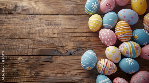 Easter eggs on wooden table with space for text
