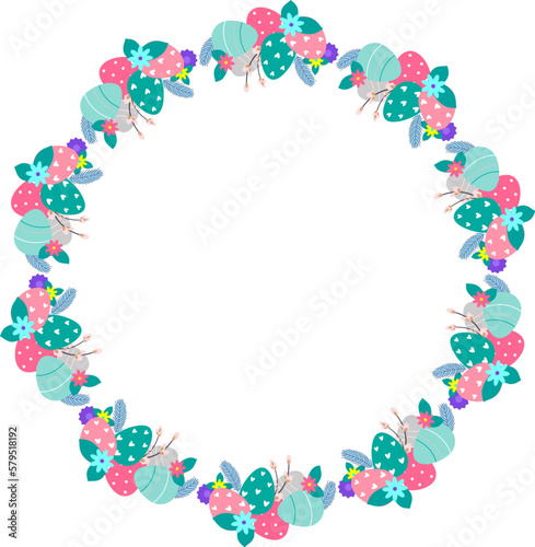 Easter flower wreath . Easter frame with decorated eggs and flowers and symbols of bright Easter