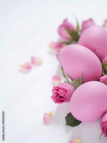 Easter greeting card with Easter eggs and pink roses on white background with copy space.