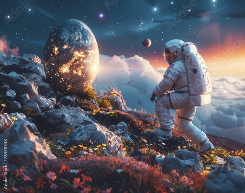 Easter in space, astronauts decorating an intergalactic egg, stars, and planets in the background