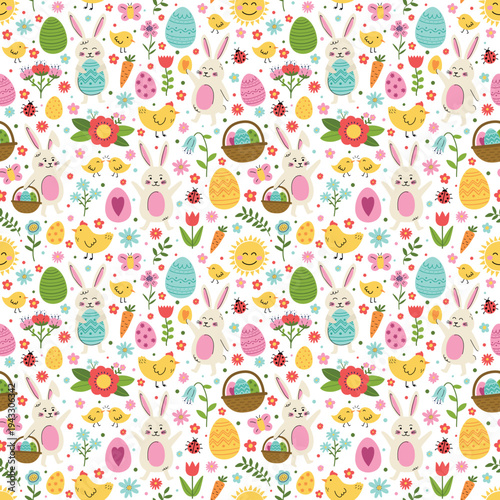 Easter seamless pattern with cute bunny, eggs, chick and flower. Cartoon style background. Vector illustration
