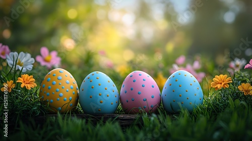 Easter setting Side view of colorful eggs and spring blooms on a wood surface with lush grass under a hazy, sun-drenched garden scene.